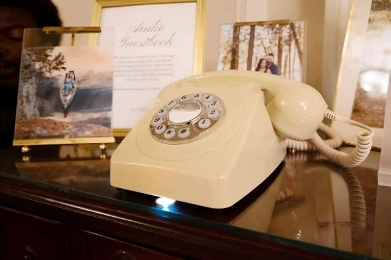 Véritable alternative au livre d’or traditionnel avec stylo et papier, un livre d’or de audio est un téléphone à cadran de style rétro où les invités peuvent décrocher le récepteur et entendre une salutation préenregistrée du couple, avant de laisser leur propre message vocal. pour que les jeunes mariés après le bip soient chéris pour les années à venir.